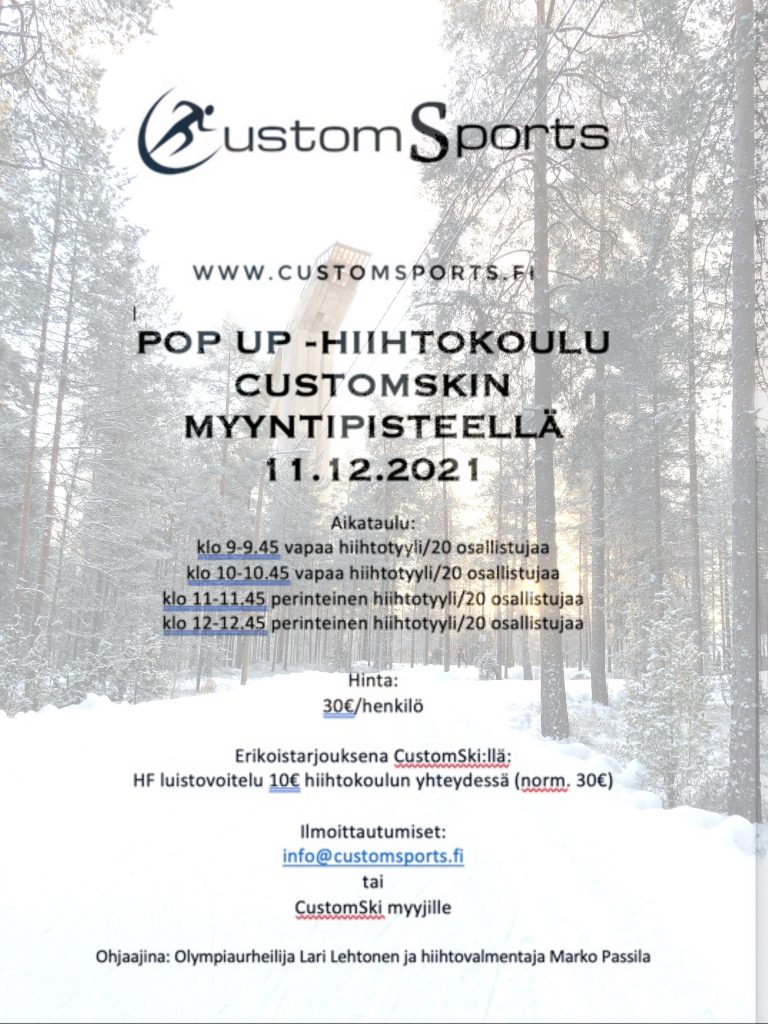 CustomSports järjestää rullahiihtokurssin 3.6.2022. Heinsuon Urheilukeskuksessa. Kurssilla on kaksi eri ryhmää. Toinen ryhmä on aloittelijoille ja toinen aikaisempaa kokemusta omaaville. Jos et omista rullasuksia tarjoamme mahdollisuuden lainata rullasuksia (vain nnn sopiva side), jolloin mukaan tarvitset sauvat, monot, kypärän ja mahdolliset muut suojavarusteet. Jokainen osallistuu kurssille omalla vastuulla ja huolehtii omasta vakuutusturvastaan. Kurssin hinta on 29€/henkilö. […]
